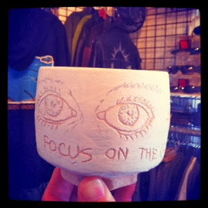 Sgraffito drawings on clay mugs